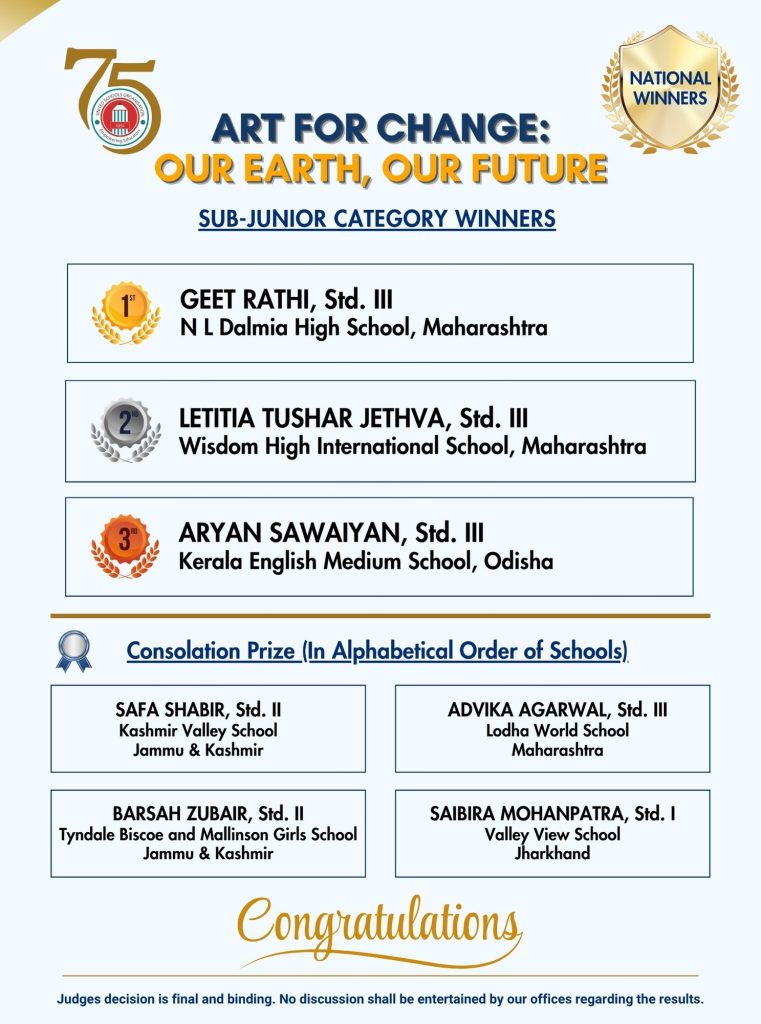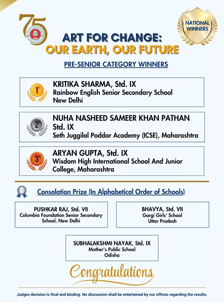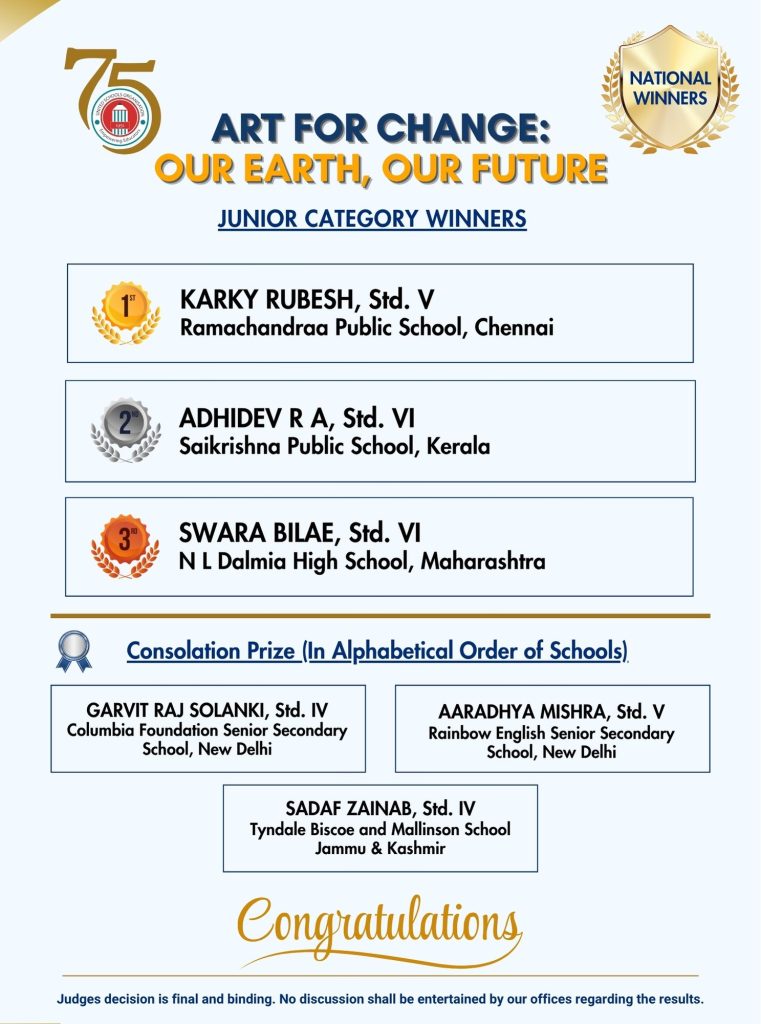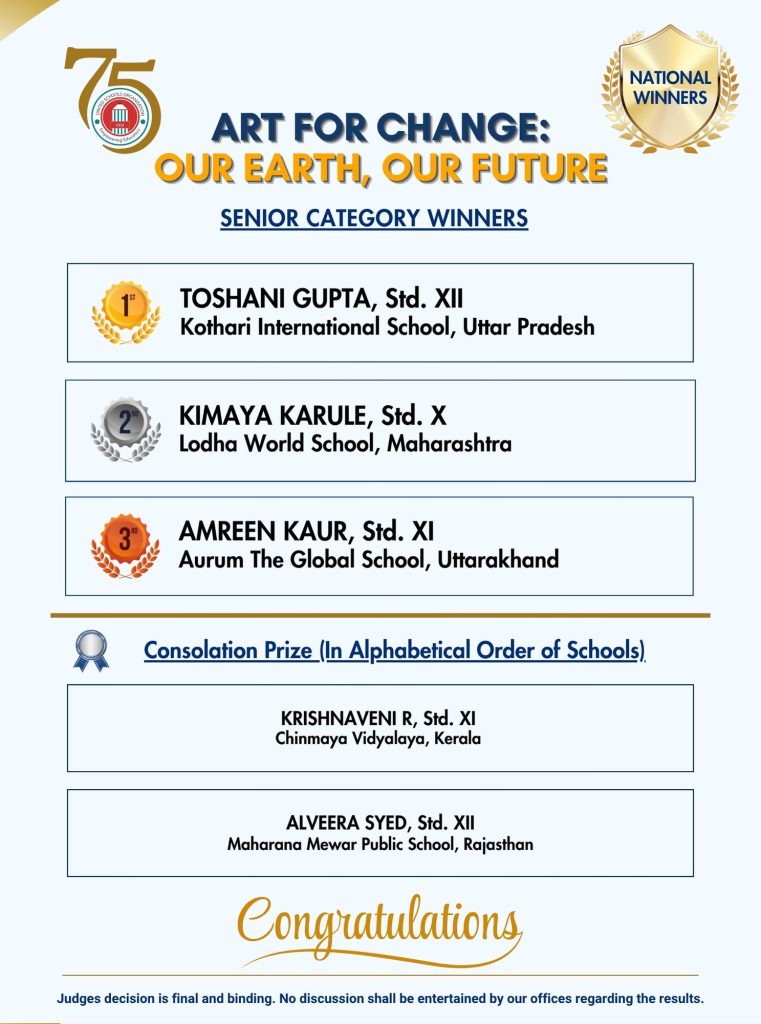 ‘Art for Change: Our Earth, Our Future’ is more than just a painting competition — it is a movement of hope, action, and imagination. This year, we invite schools and students from across India to come together and use their creative voices to shape a brighter, greener tomorrow. Through colours and creativity, let us raise awareness about the importance of protecting our environment and inspire meaningful change. Each artwork will become a message — a message for sustainability, unity, and a better future for all.
