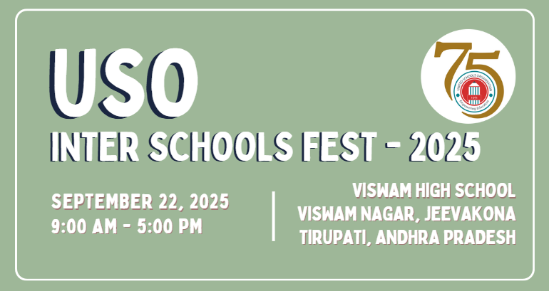 The USO Inter Schools Fest 2025 at Tirupati, Andhra Pradesh shall be held on Monday, September 22, 2025, from 9 am onwards.